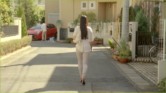 玄関から出てきたこにしまなみが近所の親子と挨拶を交わす。画面は親子に切り替わるため、親子の背後にはこにしさんの後姿が見える。