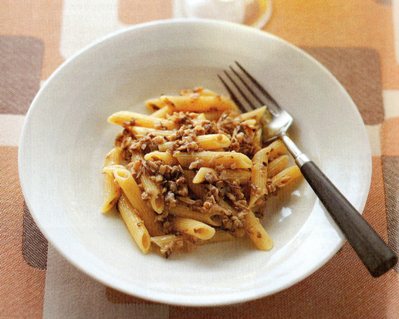 作り方は、「しめじ、しいたけ、マッシュルームをフードプロセッサーにかけて炒め煮にする…」という簡単なモノ。サンプル画像で見ると、粉砕されたきのこの破片は程よい大きさにあり、ペンネもいい具合に色付いている。