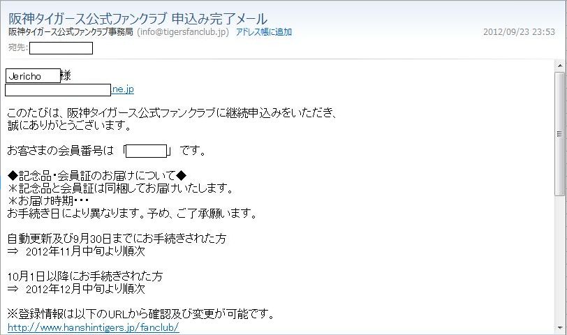 〝阪神タイガース〟ファンクラブへの継続手続きを完了しました!